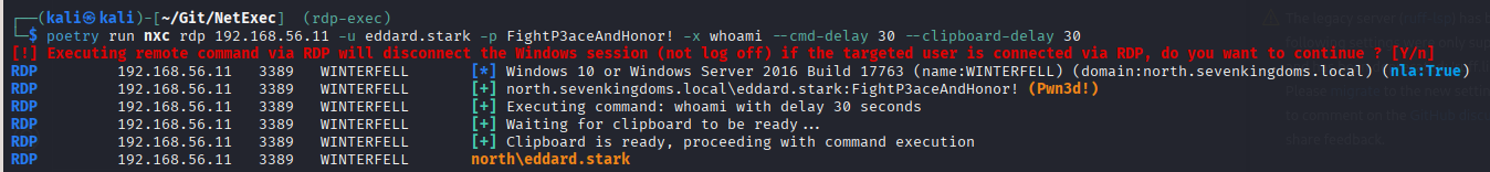 netexec rdp ip -u user -p password -x whoami
